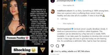 आज सकाळी अभिनेत्री पूनम पांडे हिचे सर्व्हायकल कॅन्सरने निधन झाले अशी बातमी आली आणि सर्वांनाच धक्का बसला. तिच्यासोबतच्या काही कलाकारांनी देखील खरंतर तिच्या मृत्यूबाबत दुःख व्यक्त केलं.